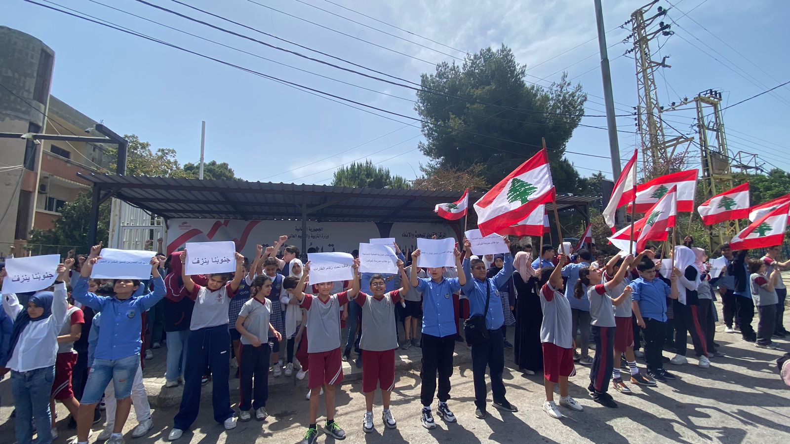 نفذ تلامذة المدرسة العمانية النموذجية الرسمية - صيدا مع تلامذة الجنوب وقفة تضامنية , بعد إصابة عدد من تلامذة مدرسة شوكين الرسمية في النبطية بجروح , إثر غارة اسرائيلية استهدفت الباص الذي كان يقلهم إلى المدرسة .