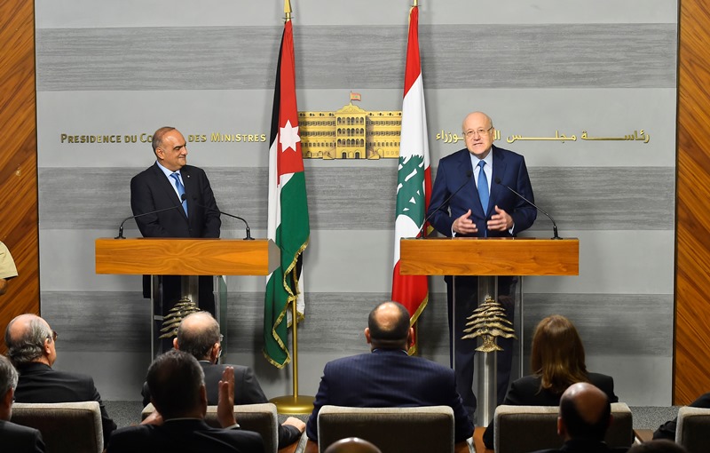 في ختام المحادثات عقد الرئيسان ميقاتي والخصاونة لقاء صحافيا مشتركا استهله الرئيس ميقاتي بالقول" بداية أحب ان أعبر عن سعادتي الكبيرة باستقبال السيد رئيس الوزراء في المملكة الاردنية الهاشمية الشقيقة بكل ما للكلمة من معنى. فاليوم الزيارة على رمزيتها، هي زيارة للتعبير عن التضامن والاخوة مع لبنان والشعب اللبناني. وهذا في الحقيقة ليس غربيا عن الاردن، واذا نظرنا الى تاريخ العلاقات بين البلدين فهي كانت الى جانب لبنان في كل المحن آلتي مر بها، كما أن لبنان كان الى جانب الاردن دائما، فنحن دول في المنطقة وكل منا يمر بمحنة ، ولكن كنا دائما اخوة بكل ما للكلمة من معنى".