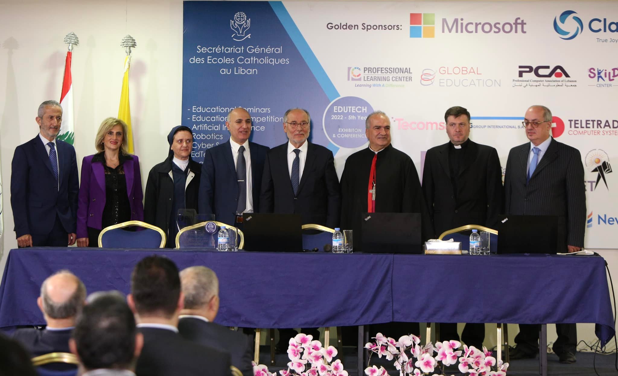 افتتح المعرض التكنولوجي التربوي الخامس تحت عنوان Edutech 2022: مستقبل التربية، برعاية وزير التربية والتعليم العالي القاضي الدكتور عباس الحلبي، في مقر الأمانة العامة للمدارس الكاثوليكية في عين نجم، بحضور عضو لجنة التربية النيابية النائب إدغار طرابلسي، رئيس المركز التربوي للبحوث والإنماء جورج نهرا، رئيس اللجنة الأسقفية للمدارس الكاثوليكية المطران حنا رحمة، عضو اللجنة الأسقفية الأم ندى طانيوس والهيئة التنفيذية، مستشار وزير التربية للشؤون التربوية البروفيسور منير ابو عسلي والفريق العامل في وزارة التربية والمركز التربوي، نقيب المعلمين رودولف عبود ، رئيس جمعية المقاصد الدكتور فيصل سنو، المدير العام لجمعية المبرات الخيرية الدكتور محمد باقر فضل الله، عمداء ومدراء كليات التربية في الجامعات الخاصة في لبنان، رؤساء المؤسسات التربوية وممثليهم في اتحاد المؤسسات التربوية الخاصة، رؤساء إتحادات لجان الأهل، المعلمين، أصحاب الشركات الداعمة للمعرض وشخصيات سياسية وعسكرية وأمنية وروحية وتربوية، ممثلي وسائل الإعلام.